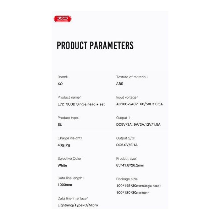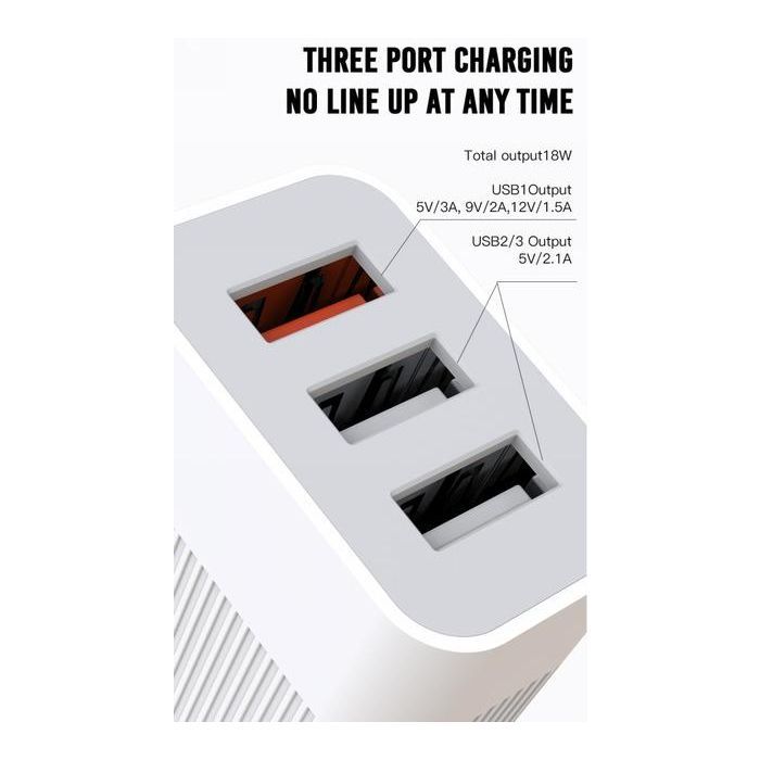 • Модель USB L72 (3A, QC3.0, 3 Usb) + cable Micro USB White