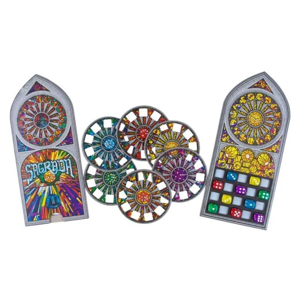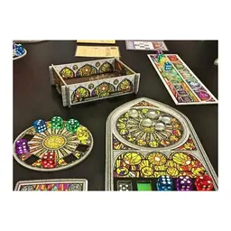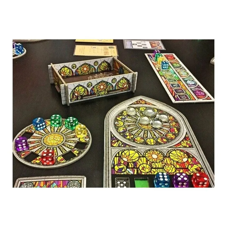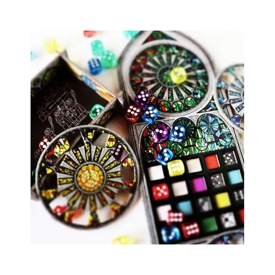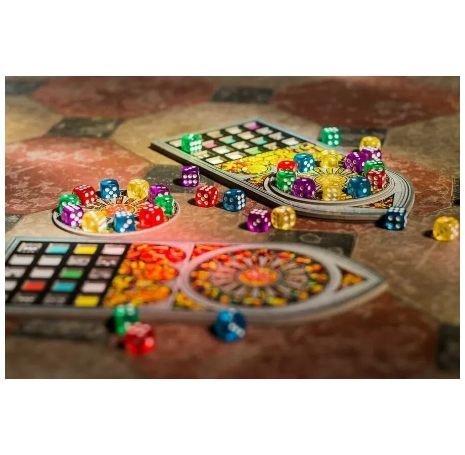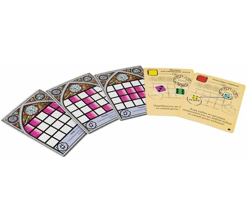 Это дополнение не только увеличивает возможное количество участников партии до 5—6 игроков, но и вносит ощутимое разнообразие в базовую игру. В дополнении вас ждёт новая механика, ускоряющая процесс игры, а также новые карты личных целей, инструментов и витражей и даже коробочка для кубиков. Новые правила роз кубиков можно включить в игру по желанию. Они применяются при игре с 2—6 участниками. При игре с этими правилами раздайте каждому участнику по 1 розе кубиков и 2 кубика каждого цвета. Игроки бросают кубики и раскладывают их по любым ячейкам розы. Теперь в качестве одного из действий на выбор игрок может забрать кубик со своей розы кубиков, а в резерве на 1 кубик на игрока меньше. Игра становится более контролируемой и при этом динамичной. Кроме того, наше издание содержит трей для кубиков и одну промокарту витража, обе стороны которой не содержат ни одной белой клетки.