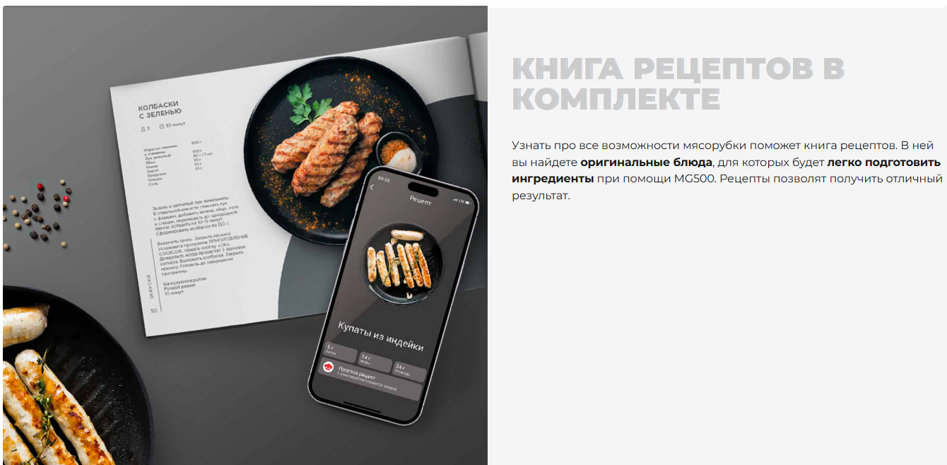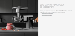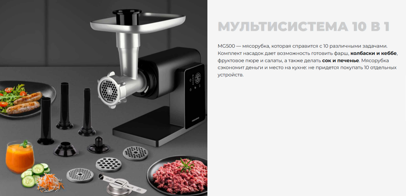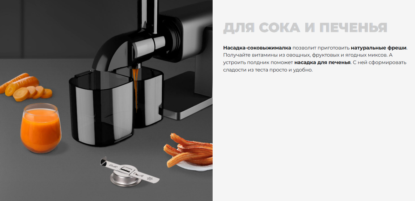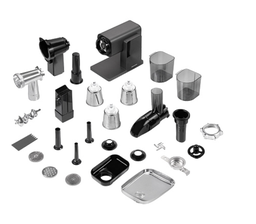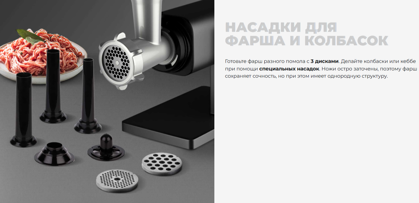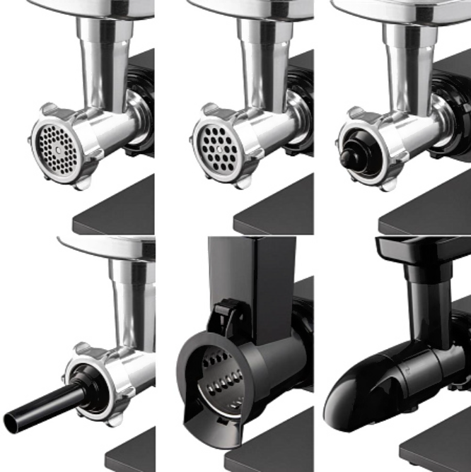 • Насадки диск/решетка для фарша (3 шт.), для «кеббе», для домашней колбасы, для шинковки, соковыжималка, для печенья, терка (2 шт.)
