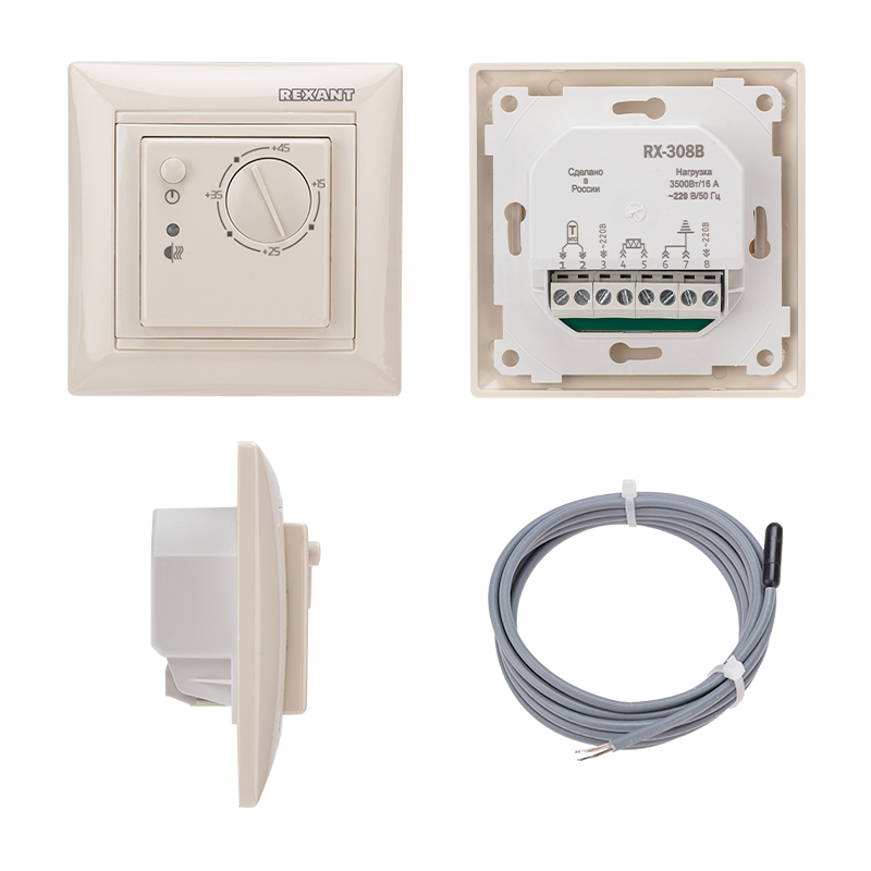 Электронный термостат RX-308B (бежевый) встраиваемый, корпус бежевый, диапазон регулировок +15°C/+45°C, коммутируемый ток контактов 16 A, внешний датчик температуры 10 кОм.
