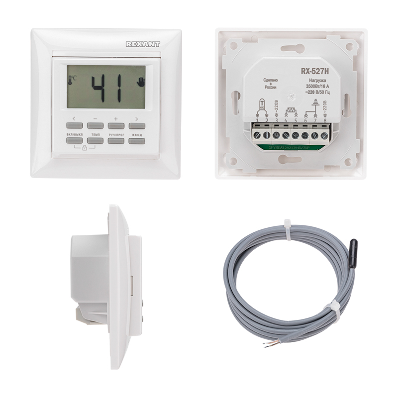 Электронный термостат RX-527H встраиваемый, программируемый по дням недели и часам в сутки, корпус белый, диапазон регулировок + 5°C/+40°C, коммутируемый ток контактов 16 A, внешний датчик температуры 10 кОм.