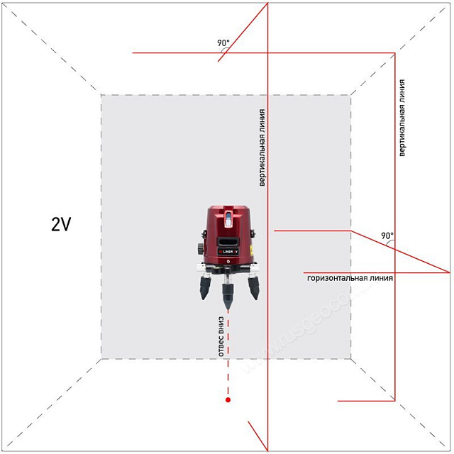 Нивелир ADA 3D LINER 2V строит 2 вертикальные линии (2V), 1 горизонтальную (Н), точку отвеса (D).