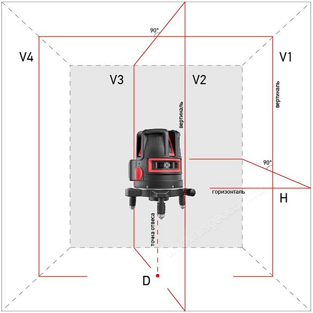 Лазерный уровень ADA PROLiner 4V проецирует горизонтальную линию на 140° и 2 вертикальные на расстоянии до 70 метров с приемником. Лазерный отвес поможет установить прибор в нужной точке помещения, например, в центре комнаты.