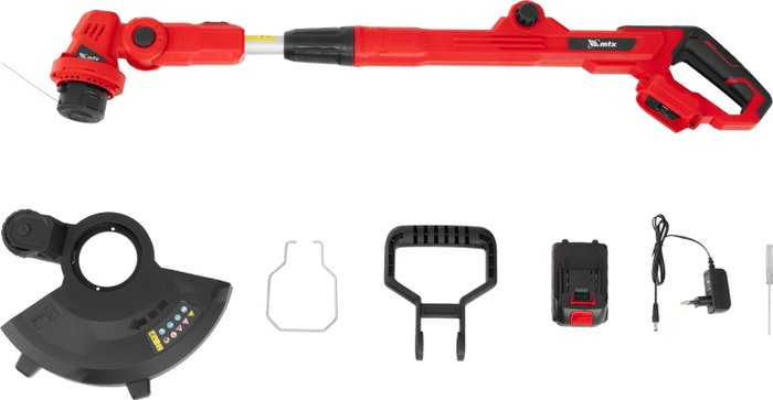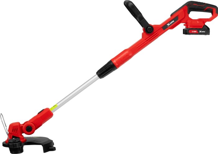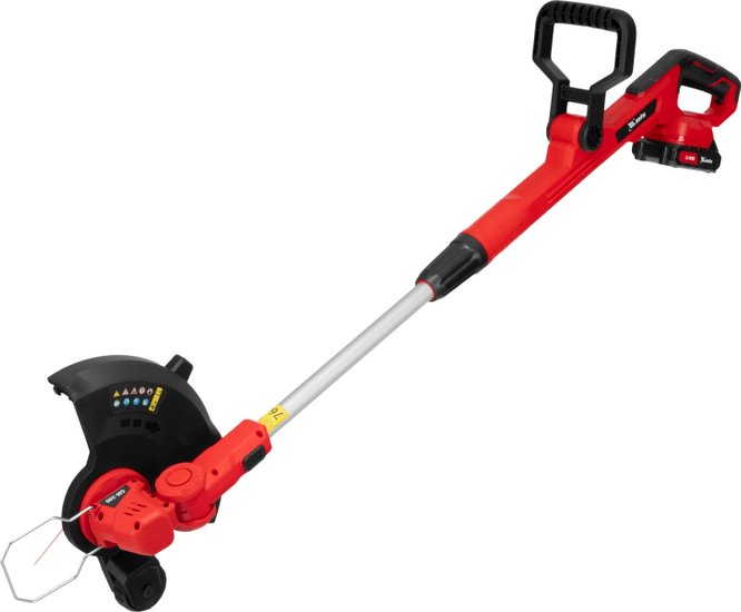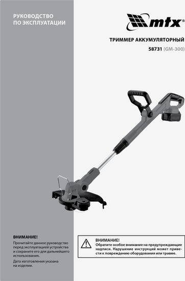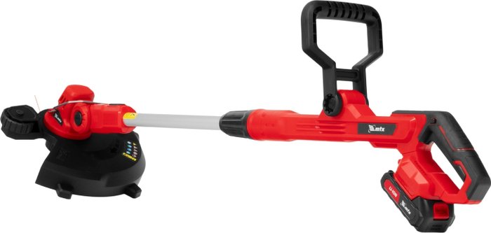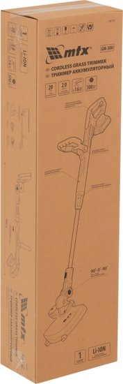 Комплектация- Триммер- Комплект крепежа- Кожух защитный- Аккумуляторная батарея- Зарядное устройство- Руководство по эксплуатации с гарантийным талоном