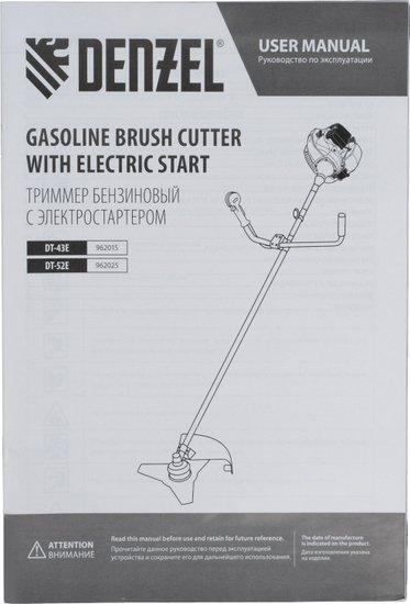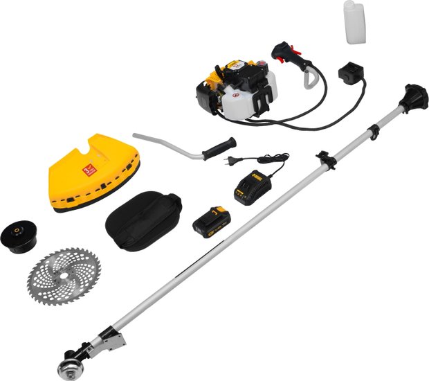 • Комплектация - Двигатель с правой рукояткой 1 шт - Левая рукоятка 1 шт - Штанга 1 шт - Защитный кожух с ножом 1 шт - Катушка с леской 1 шт - Пильный диск 40Т 1 шт - Дозатор для приготовления смеси 1 шт - Ремень плечевой с защитой бедра 1 шт - Узел крепления рукояток с крепежом 1 шт - Свечной ключ 1 шт - Шестигранник H5 1 шт - Шестигранник H6 1 шт - Болт M6×20 4 шт - Болт M5×15 4 шт - Гайка M5 4 шт - Аккумулятор 1 шт - Зарядное устройство для аккумулятора 1 шт