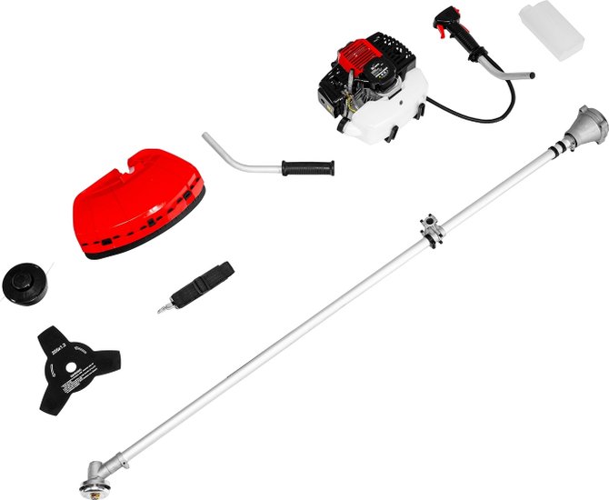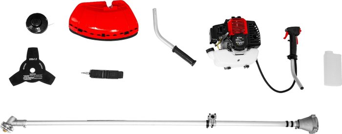 Комплектация- Двигатель с правой рукояткой 1 шт - Левая рукоятка 1 шт - Штанга 1 шт - Защитный кожух с ножом 1 шт - Кронштейн защитного кожуха 1 шт - Катушка с леской 1 шт - Нож трехлопастной 1 шт - Дозатор для приготовления смеси 1 шт - Ремень плечевой 1 шт - Корпус сцепления с крепежом 1 шт - Редуктор с винтами 1 шт - Узел крепления рукояток с крепежом 1 шт - Узел подвеса ремня 1 шт - Свечной ключ 1 шт - Имбусовый ключ Н5 1 шт - Имбусовый ключ Н6 1 шт - Болт M6×20 4 шт - Болт M5×15 2 шт - Гайка M5 2 шт - Хомут 2 шт - Соединительная муфта 1 шт - Коннектор штанги 1 ш - Руководство по эксплуатации с гарантийным талоном 1 шт