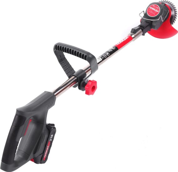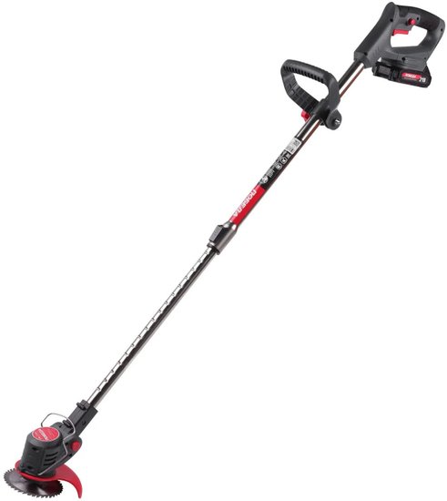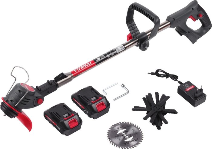 • Комплектация - триммер, - рукоятка, - защитный кожух, - набор для сборки, - фиксатор рукоятки, - нож триммерный (пластик) 10шт., - металлический диск (сталь) 1шт., - АКБ 2шт., - ЗУ, - инструкция.
