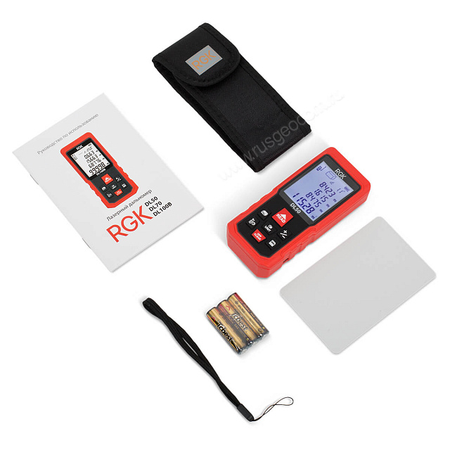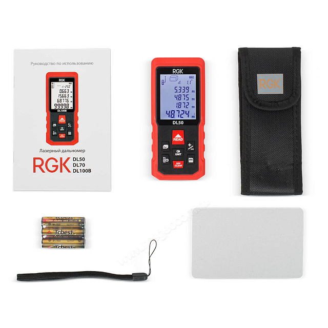 Питание лазерного дальномера RGK DL50 осуществляется от трех батареек типа ААА или аккумуляторов аналогичного формата. Одного комплекта батарей хватает для 8000 измерений. Для экономии заряда лазер и подсветка экрана автоматически отключаются через 20 секунд, а сам прибор - через 2,5 минуты.