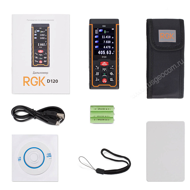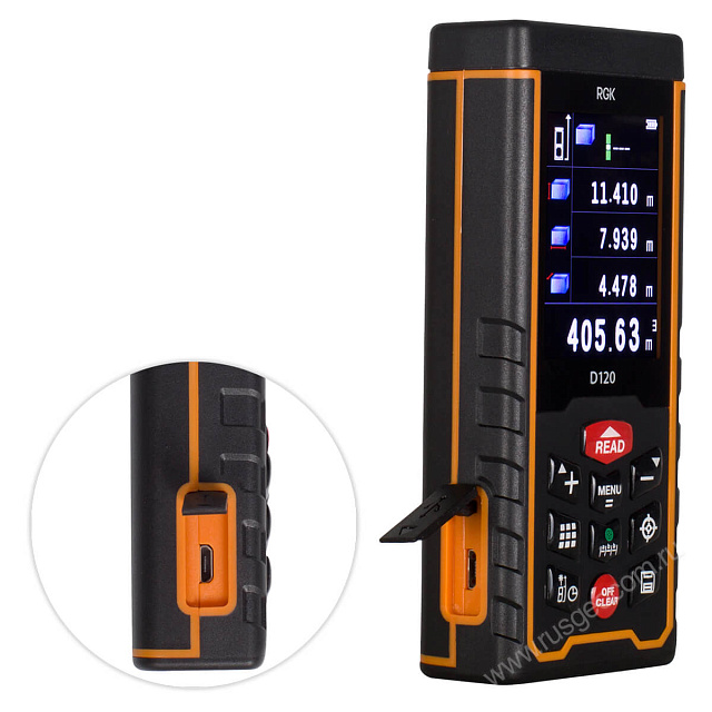 Micro-USB — служит для загрузки сохранённых данных на ПК для последующей обработки в программе LDM Studio, поставляемой в комплекте с RGK D120 (с поверкой). С помощью этой программы вы сможете мгновенно распечатать результаты измерений или выгрузить их в таблицу Excel. В таблице содержится информация обо всех замерах и результатах вычислений, а также о промежуточных значениях при подсчёте площадей и объёмов.
