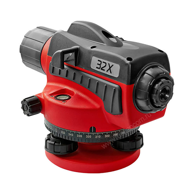 Оптика нивелира имеет 32-кратное приближение. Установлена просветленная оптическая система, которая облегчает выполнение работ в условиях недостаточной освещенности. Она дает в окуляре прямое изображение нивелировочной рейки, что облегчает выполнение замеров.