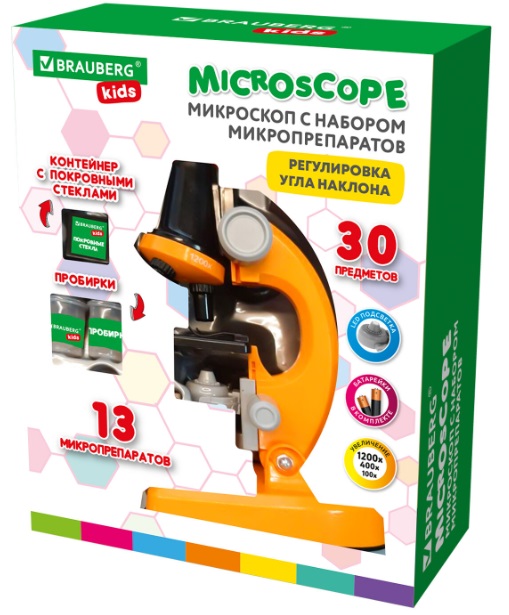 Игровой набор BRAUBERG KIDS, "Микроскоп" 30 предметов (12 микропреп.), 100/400/1200х, подсветка,