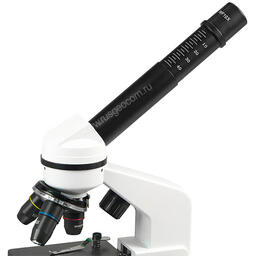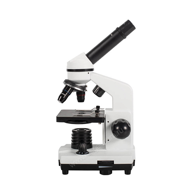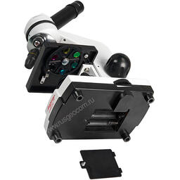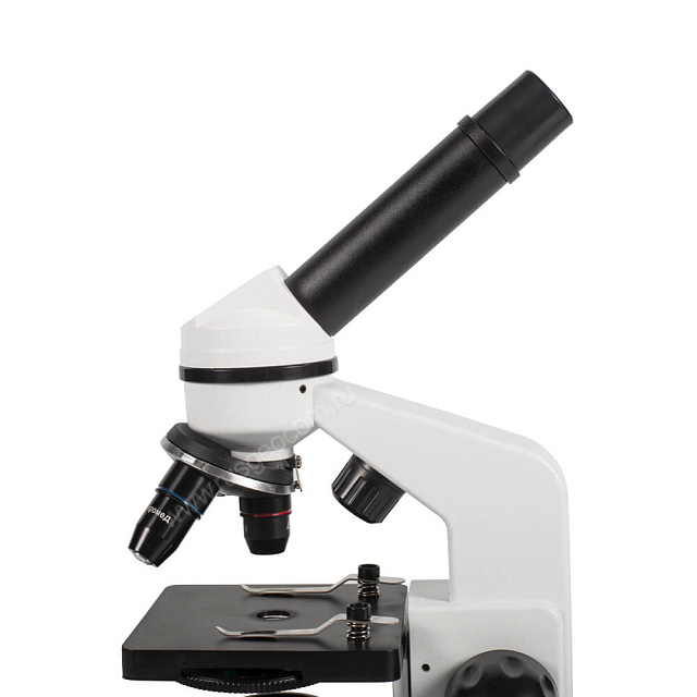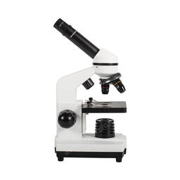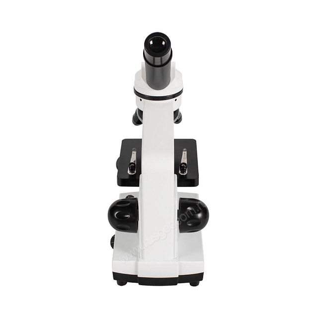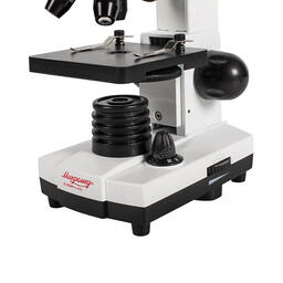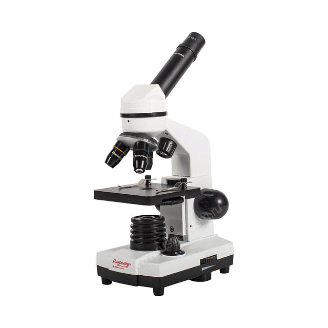 В револьверном устройстве школьного микроскопа закреплено 3 объектива. Основа оптической системы - линза Барлоу с двухкратынм увеличением. Схема освещения построена на точечных светодиодах с регулируемой яркостью, которые питаются от батареек. Конденсор включает в себя 6 диафрагм со светофильтрами для разноплановых опытов. Предметный столик оборудован 2 подпружиненными зажимами для надежной фиксации препаратов.