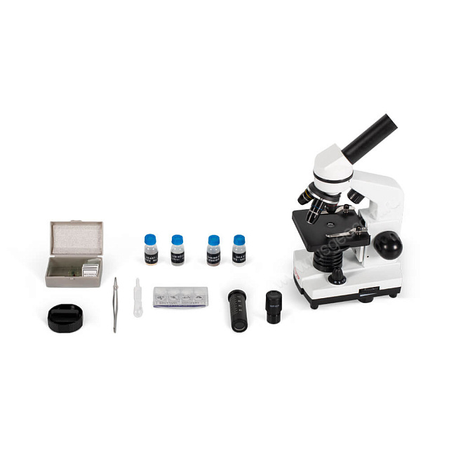Помимо крепкого защитного кейса в комплект входят предметные и покровные стекла, несколько готовых препаратов, а также набор для самостоятельного создания образцов.