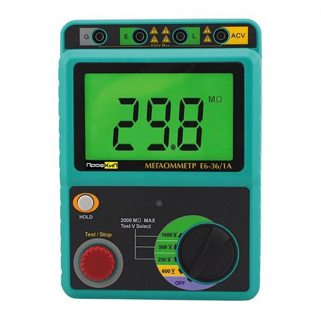 Мегаомметр ПрофКиП Е6-36/1А измеряет сопротивление изоляции в диапазоне от 1 кОм до 2000 МОм. Измеритель сопротивления изоляции позволяет производить измерение напряжением от 250 В до 1000 В, которое разбито на 3 фиксированных режима. Помимо сопротивления, прибор позволяет измерять напряжение электрической цепи до 600В. Тестер изоляции ПрофКиП Е6-36/1А при измерении выводит показания на ЖК-дисплей, оснащенный подсветкой.