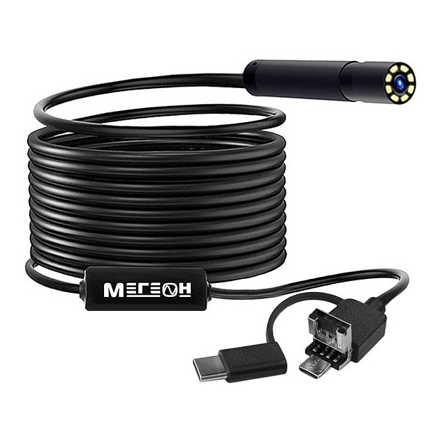 МЕГЕОН 33033 – это многофункциональный видеоскоп с ультратонкой камерой диаметром пять с половиной миллиметров, мягким зондом длиной 3 метра, оснащён универсальной вилкой три в одной позволяющей без использования сторонних переходников подключать его к гнёздам USB, microUSB и USB-type-C. Видеокамера высокой чёткости с защитой (IP67), со встроенной регулируемой светодиодной подсветкой, автоматической регулировкой фокуса и яркости. Он не требует источника питания так как подключается к порту и питается от него. В комплекте поставки: съёмное зеркало (перископ) для обзора по бокам, магнитный держатель и крючок для возможности извлечь упавшую деталь. В зависимости от используемого ПО возможна видео- и фотофиксация изображения. Прибор найдёт широчайшее применение там, где в труднодоступных местах нужно увидеть без дополнительной разборки.