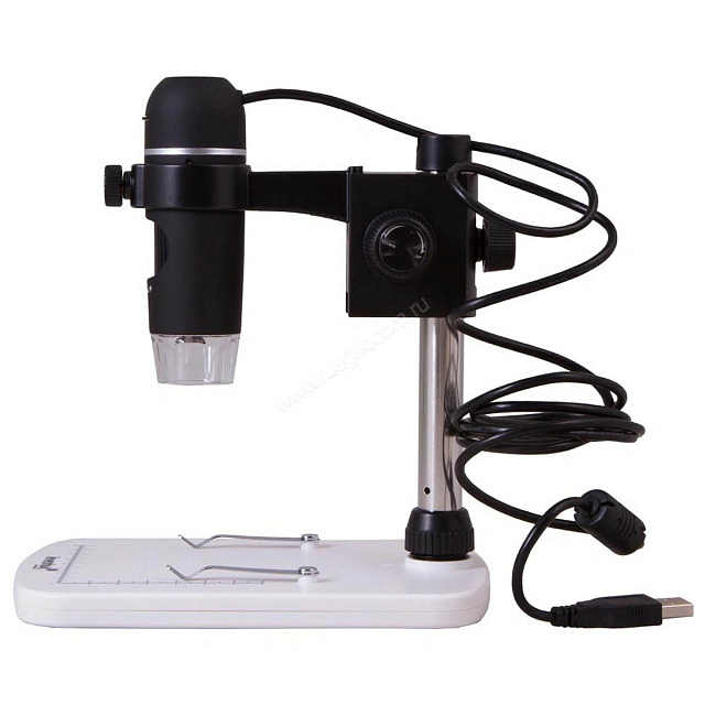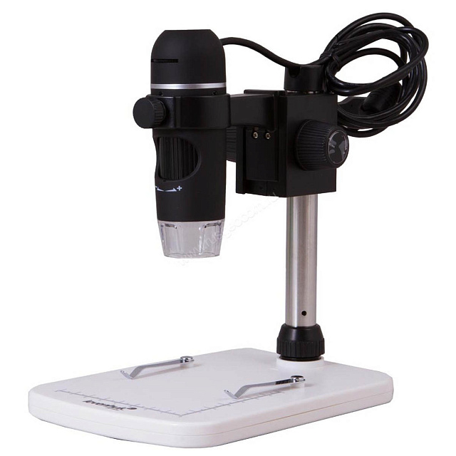 Профессиональный штатив оборудован точными регулировочными винтами, которые помогают выставить прибор именно так, как того требуют условия исследования. 2 зажима на предметном столике отвечают за надежную фиксацию объекта. На основание нанесена измерительная шкала, которая упрощает предварительную визуальную оценку размеров.