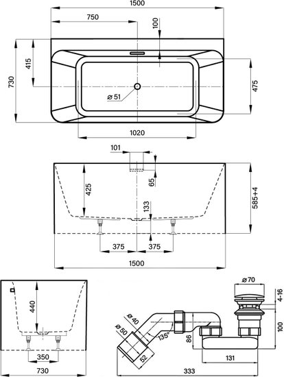 Clermont 150x73 28260102R (пристенная ванна белый глянец, экран, ножки, сифон-автомат глянцевый белый)