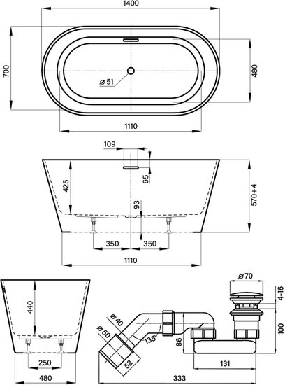 Shell 140x70 28170101R (отдельностоящая ванна белый глянец, экран, ножки, сифон-автомат хром)