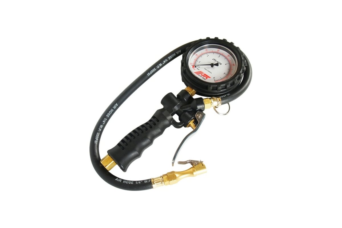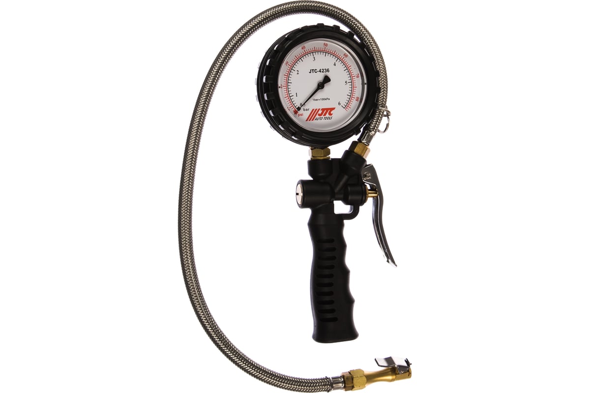 3-х функциональный шинный манометр JTC 4236 предназначен исключительно для профессионального использования. Применяется во время сезонного и индивидуального технического обслуживания самых различных марок автомобилей. С помощью данного прибора можно не только осуществить измерение внутришинного давления, но и отрегулировать его до требуемых параметров. Погрешность измерений при давлении от 30 до 45 psi - + 1 psi, более 45 psi - ± 2 psi.