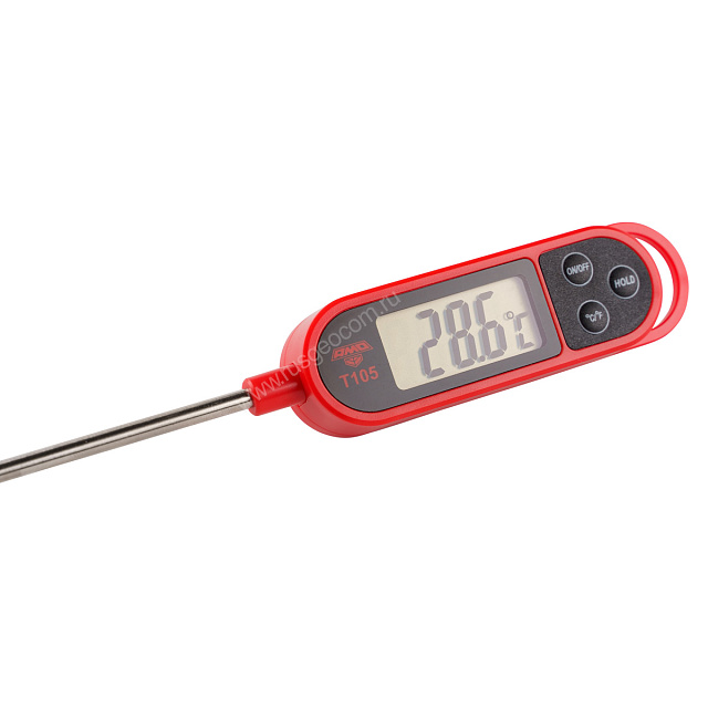 Цифровой термометр AMO T105 оборудован тонким зондом длиной 145 мм, который позволяет удобно работать с самыми разными продуктами. Небольшой, около 3 мм, диаметр наконечника, в котором расположен измерительный сенсор, гарантирует, что товарный вид объекта контроля, а в ресторанах и кондитерских - презентация продукта, не будут нарушены.