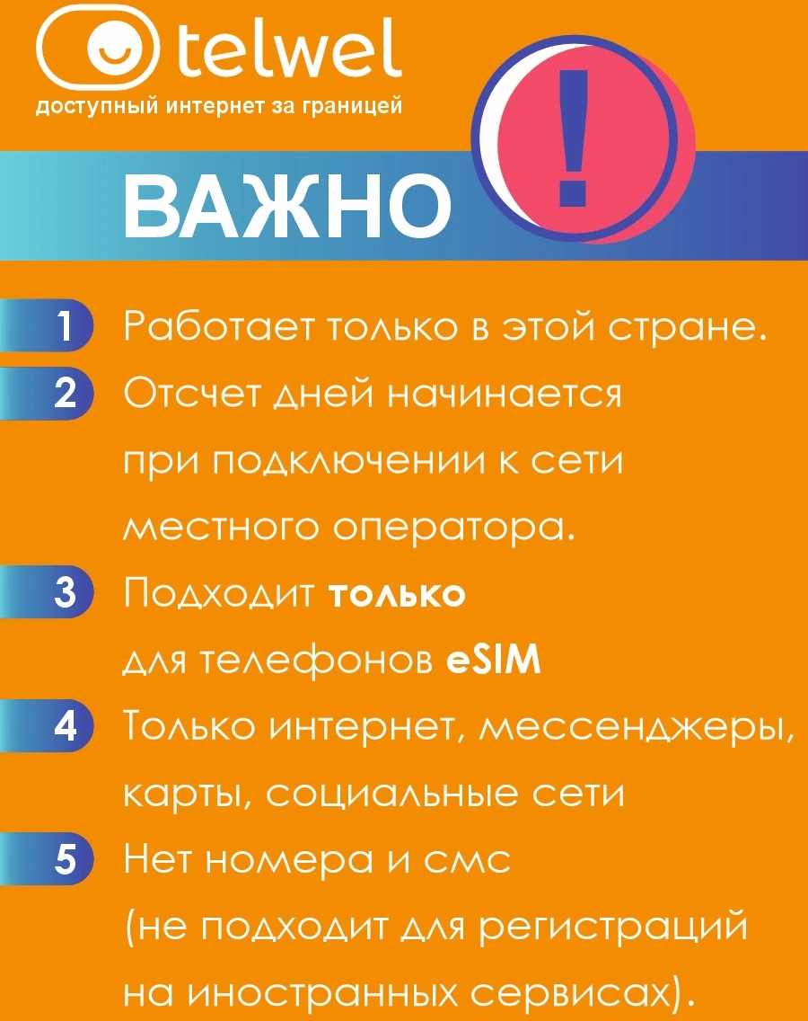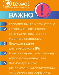 - Описание Электронная eSIM-карта Telwel ОАЭ Эмираты на 3Гб 30 дней с пакетом интернета позволяет выгодно сэкономить на роуминге за границей. Можно пользоваться интернетом, социальными сетями, мессенджерами, Google картами и другими интернет-сервисами.