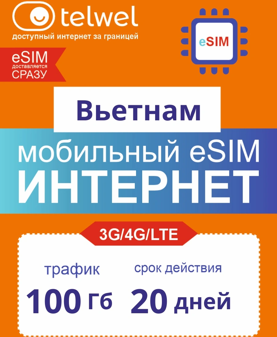 - Описание Электронная eSIM-карта Telwel Вьетнам 75Гб на 15 дней с пакетом интернета позволяет выгодно сэкономить на роуминге за границей. Можно пользоваться интернетом, социальными сетями, мессенджерами, Google картами и другими интернет-сервисами.