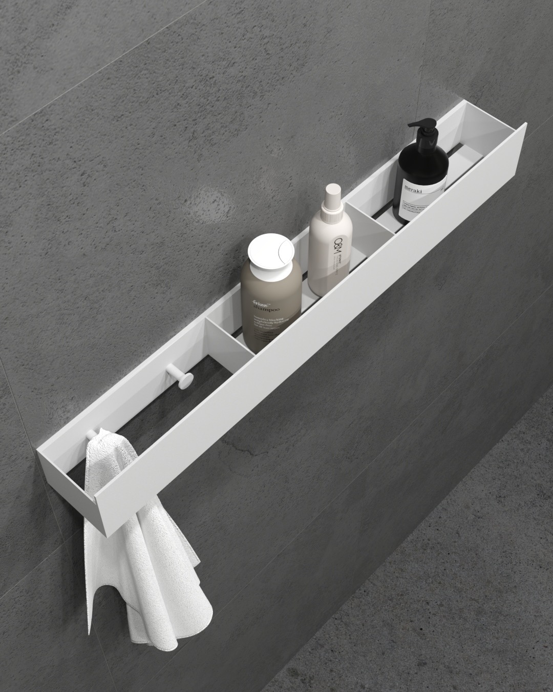 Дизайнерская полка / крючки (доступна с L/R расположением крючков) Только для использования в СУХИХ зонах Материал изготовления: сталь Габариты: 70 × 9,4 × 9 cм Вес: 3,65 кг