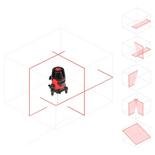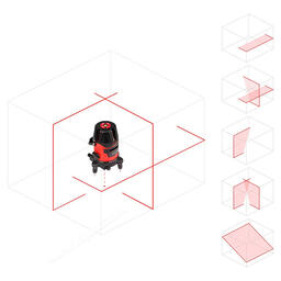При включении прибора проецируется одна яркая горизонтальная плоскость с углом развертки 110°. Используя функциональные клавиши на верхней панели лазерного уровня RGK LP-62 вы можете активировать одну или две вертикальных плоскости – 120°. Крест, образующийся при пересечении двух вертикальных линий можно использовать в качестве зенита. В сочетании с точкой надира, которая проецируется лазерным отвесом это обеспечивает возможность переноса точек разметки с пола на потолок.