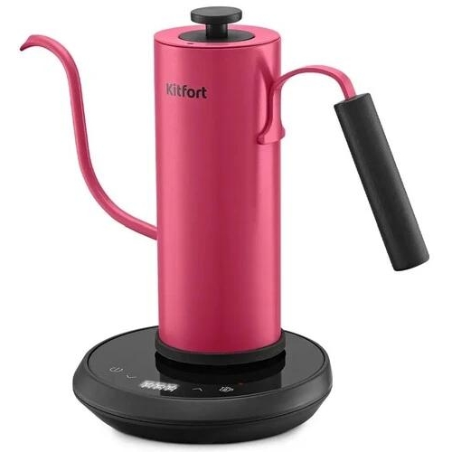 Чайник для варки кофе КТ-6759 предназначен для кипячения и нагрева воды, а также для приготовления кофе способами кемекс и пуровер. Корпус и крышка чайника выполнены из нержавеющей стали и пластика, а база — из пластика. При подключении к сети на панели управления мигнёт индикатор поддержания температуры. Для включения нагрева нужно нажать на кнопку «Вкл/Выкл». По умолчанию будет установлена температура 100 °C. Диапазон температуры: от 60 до 100 °C с шагом 1 °C. Максимальная отметка литража находится внутри чайника, а общий объём составляет 0,4 л. Внутренняя поверхность чайника полностью состоит из металла, благодаря чему вода не соприкасается с пластиком. Длинный изогнутый носик формирует тонкий, ровный поток воды, что является обязательным условием для приготовления кофе в кемексе и пуровере. После использования рекомендуется хранить чайник с защитным колпачком из комплекта. База с центральным контактом даёт возможность располагать на ней чайник в любом положении, обеспечивая вращение на 360°. Чайник автоматически отключается при закипании, имеет защиту от перегрева и от включения без воды. Полный чайник закипает за 3 минуты.