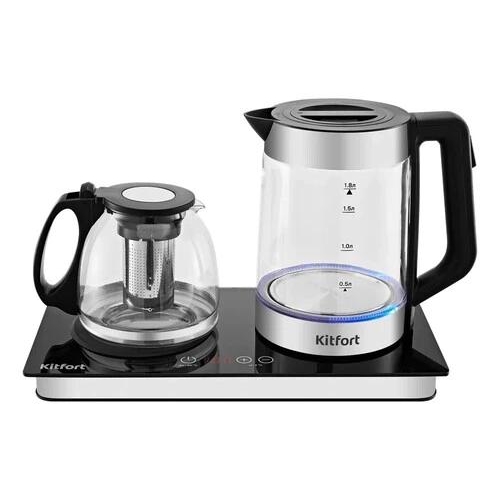 Чайный набор КТ-6650 состоит из чайника ёмкостью 1,8 л, заварочного чайника ёмкостью 1,2 л с фильтром и базы. Чайный набор позволяет не только вскипятить воду, но и заварить чай или кофе в заварочном чайнике. Сенсорная панель управления позволяет выбрать режим работы: «Чай» или «Кофе», выбрать температуру для режимов от 40 до 60 °С с шагом 5 °С и выключить устройство. Во время работы платформы с подогревом отображается установленная температура.