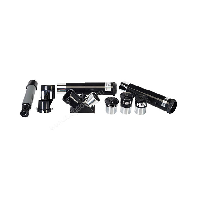 В комплект входят окуляры F20 и F6, замена которых ведет к изменению кратности увеличения – 40х и 133х соответственно. Используя линзу Барлоу с трехкратным увеличением, можно кратно изменить увеличение до 120х, 400х.