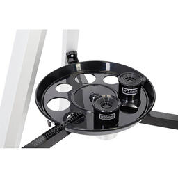 Высота металлического штатива-треноги регулируется от 72 см до 124 см за счет телескопической конструкции с винтовыми фиксаторами. Пластиковые опоры на ножках не позволяют штативу царапать поверхность пола. При использовании телескопа в "полевых" условиях пластиковые опоры выкручиваются вверх и штатив устанавливается на неровную поверхность на "шипах". Для точного выравнивания штатива сверху на корпусе размещен крупный пузырьковый уровень диаметром 25 мм, а для придания устойчивости крепится растяжка с лотком, служащая одновременно полочкой для окуляров.