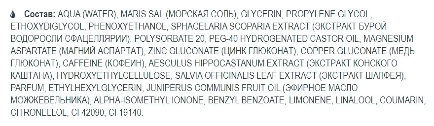 - Активные ингредиенты соль (морская), кофеин, экстракт водорослей, экстракт шалфея, экстракт конского каштана, масло можжевельника