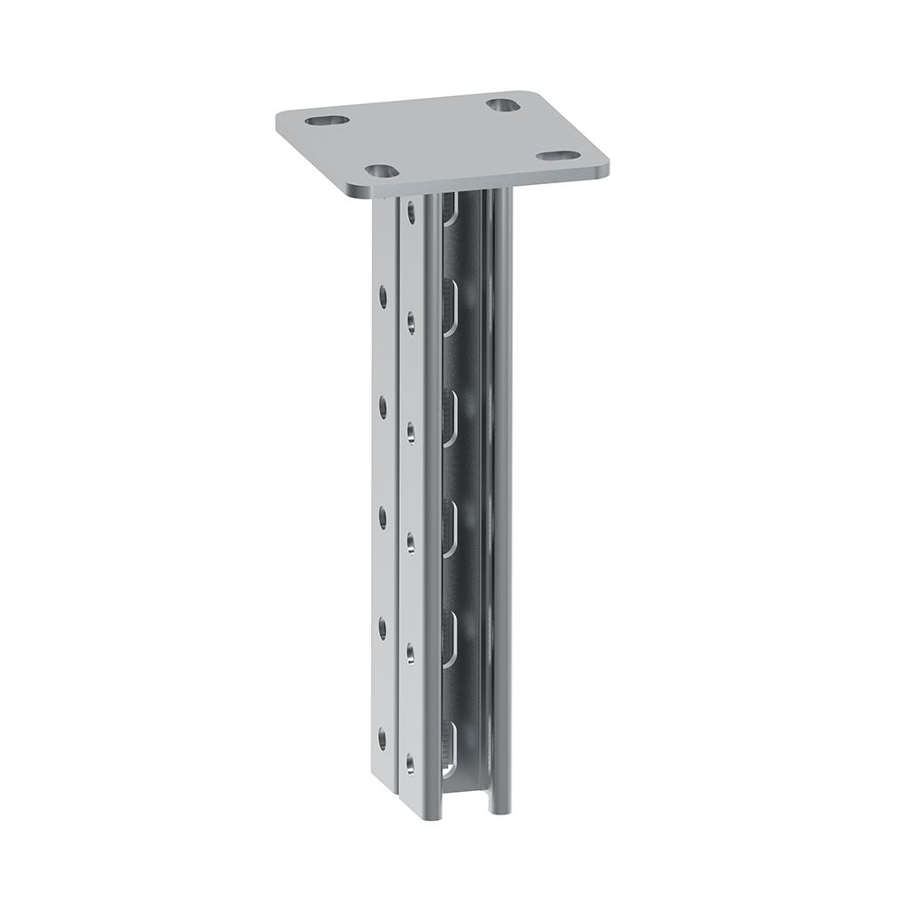 Страт-стойка используется для потолочного или напольного крепления кабельной трассы. Элемент выполнен из С-образного профиля и опорной пластины с отверстиями для крепежа. Перфорация обеспечивает удобный монтаж консолей или кабельных полок на любой высоте. Изделие выполнено из оцинкованной стали.