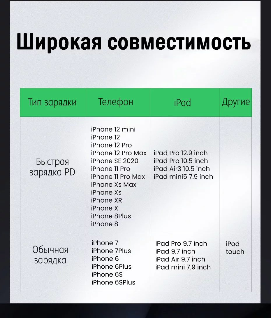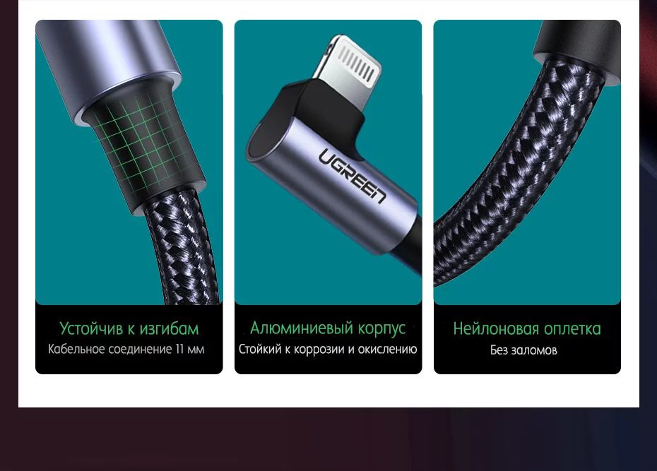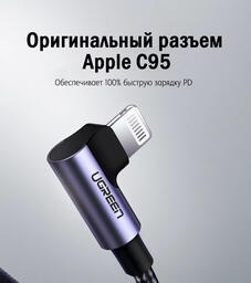 ОписаниеУгловой зарядный кабель USB C - Lightning обеспечивает высокоскоростную зарядку до 3 А (макс.) с зарядным устройством USB-C PD, чтобы зарядить iPhone X с 0% до 50% за 30 минут. Скорость передачи данных достигает 480 Мбит/с. Большие файлы размером 1 Гб будут переданы всего за 25 секунд.