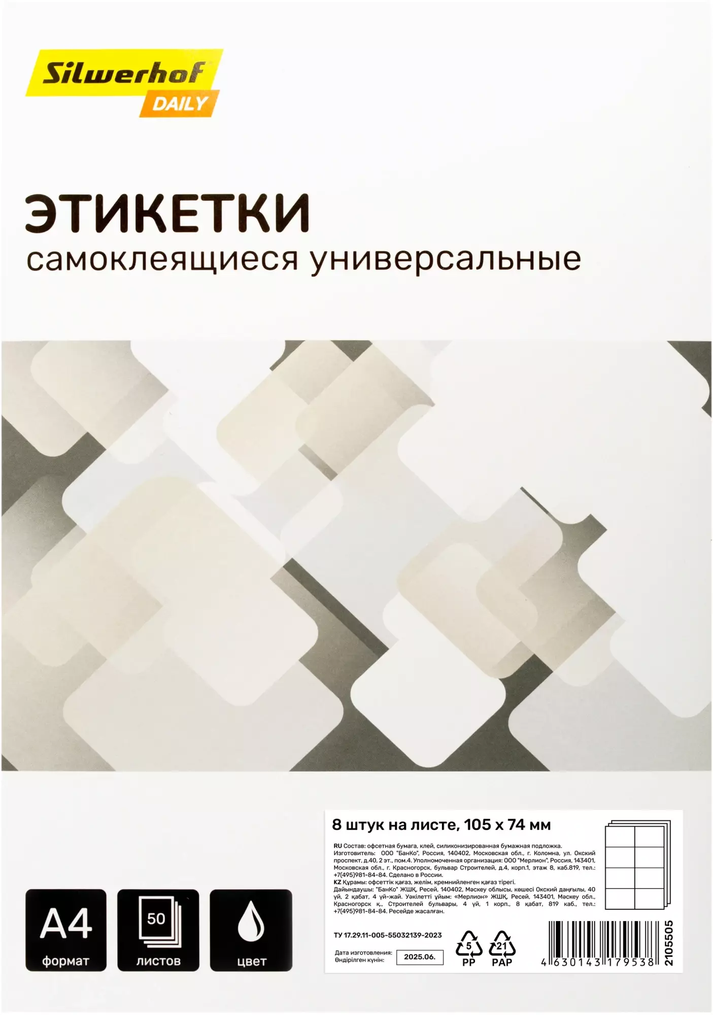 Этикетки Silwerhof A4, сегментов 8шт, 74x105, 50л., белый
