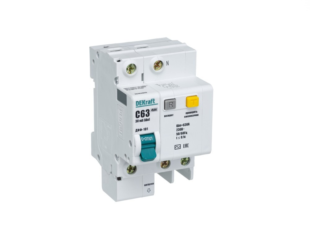 Автоматический выключатель дифференциального тока серии ДИФ-101 Dekraft; 1P+N; ном.ток 50; характеристика C; откл.способность Icn = 4,5 kA; ток утечки 300 мА; блок дифф.защиты – электронный; ширина – 3 мод. х 18 мм; монтаж – на DIN-рейку.ВДТ применяются в сетях напряжением до 400 В пер.тока для защиты электроустановок от сверхтоков и токов утечки. Для расширения функционалаВДТ возможно использованиексессуаров от выключателей серии ВА-101.