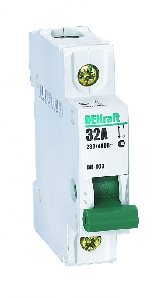 Выключатель-разъединитель серии ВН-103 DEKraft; 1P; номинальный ток 125; ширина – 1 модуль х 18 мм; установка – на DIN-рейку; установочное положение - любое. Выключатели-разъединители применяются для ручного включения/отключения сетей напряжением до 400 В. Специальные мостиковые контакты обеспечивают надежный разрыв цепи; они полностью исключают возможность перекрытия дугой по изоляции. Усиленная рукоятка управления обеспечивает большое количество включений/отключений.