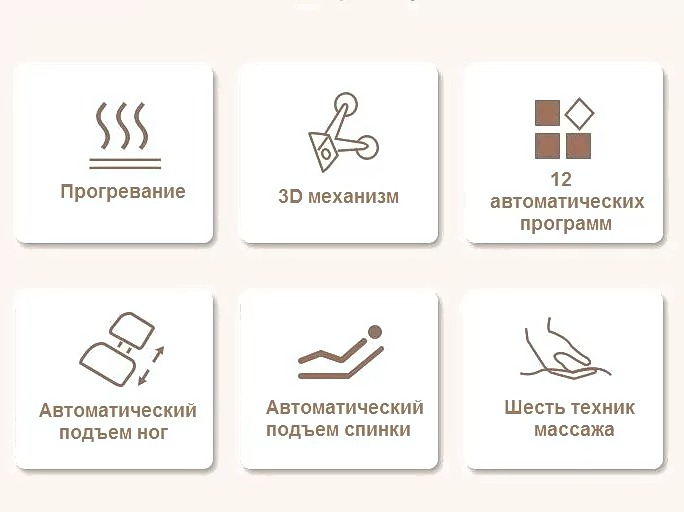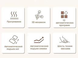 • Вид массажа 3D-массаж, акупунктура, комбинированный массаж, роликовый массаж, массаж шиацу, похлопывающий массаж, разминающий массаж, постукивающий массаж