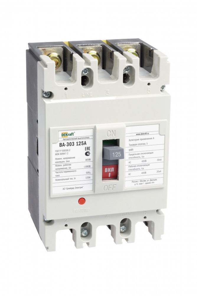 Автоматический выключатель в литом корпусе серии ВА-303 DEKraft; 3P; номинальный ток 125; откл.способность Icu = 30 кА (до 690 В пер.тока); расцепитель – термомагнитный, нерегулируемый. В комплект поставки входят 4 межфазные перегородки и крепеж на монтажной плате. В дополнение к выключателям выпускается рядксессуаров, расширяющих их функционал: сигнальные контакты, расцепители напряжения, моторные приводы, шины выносные и др.