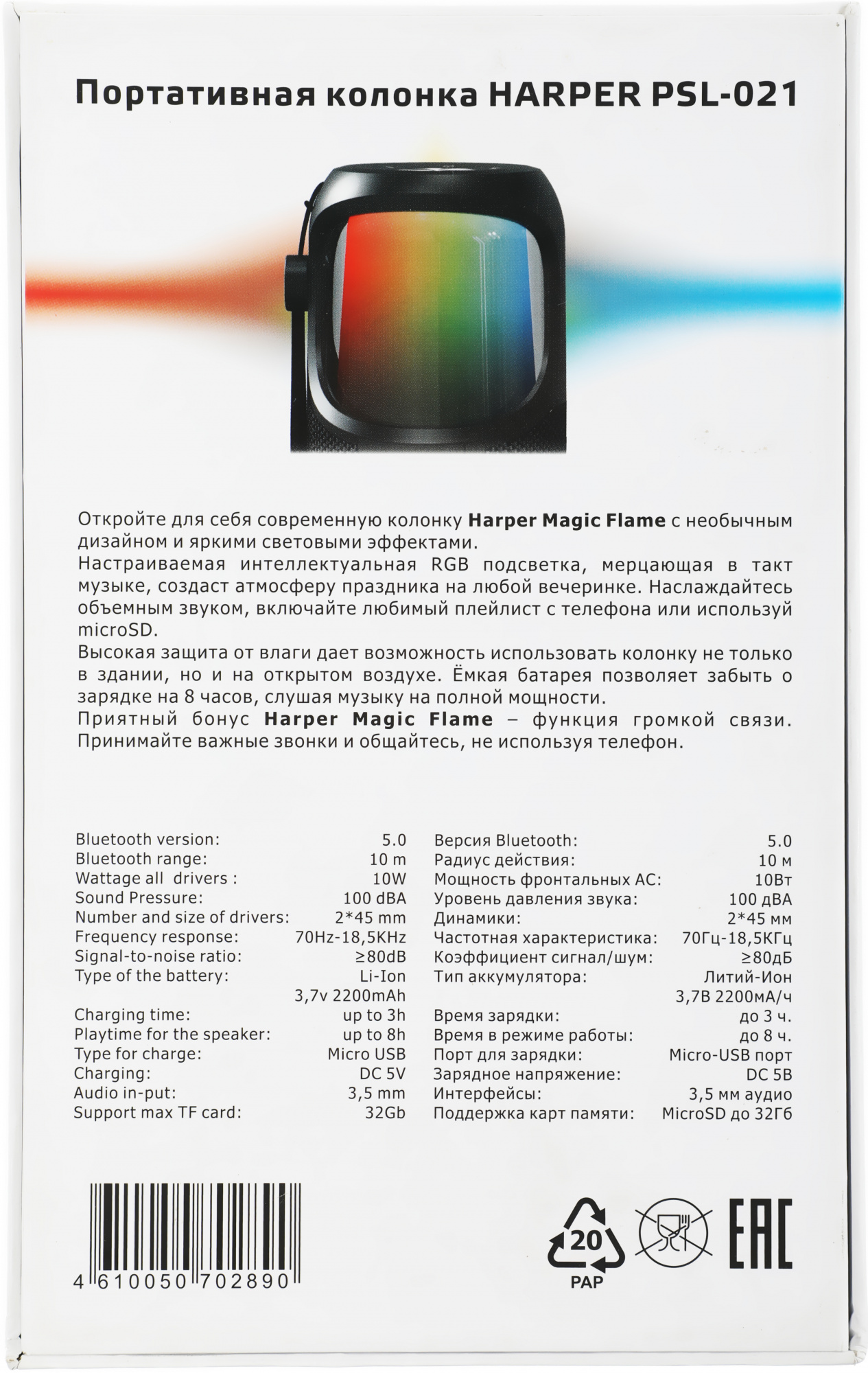 Колонка порт. Harper PSL-021 черный 10W 2.0 BT/3.5Jack 10м 2200mAh (H00002870)