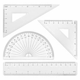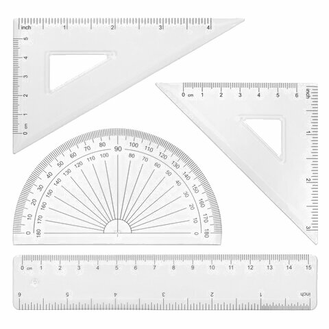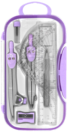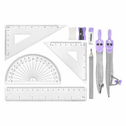 • Состав набора циркуль (2 шт.), линейка, треугольник (2 шт.), транспортир, ластик, точилка, карандаш, сменный грифель