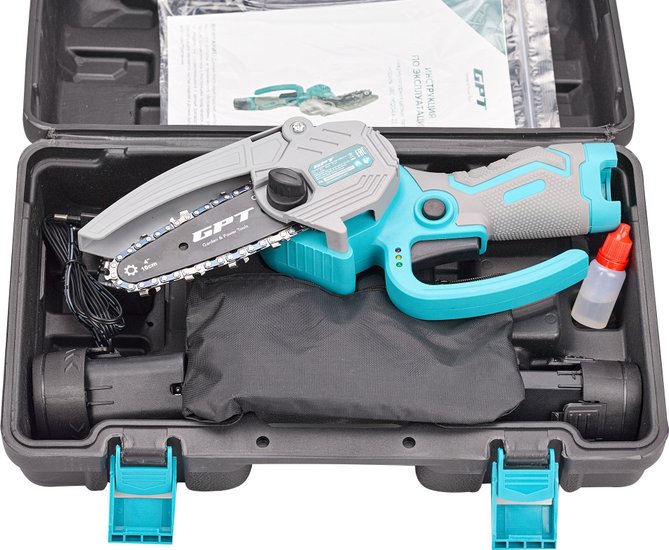 • Комплект поставки -Аккумуляторная цепная пила — 1 шт.-Шина 4" / 10 см — 1 шт.-Цепь — 2 шт. (1 установлена + запасная)-Аккумулятор Li-ion 12 В 2 Ач — 2 шт.-Зарядное устройство — 1 шт.-Ключ для обслуживания — 1 шт.-Кейс-1шт.-Руководство по эксплуатации.