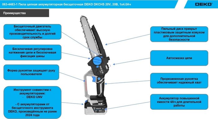 • Комплект поставки - корпус пилы – 1 шт- пильная шина – 1 шт- пильная цепь – 1 шт- защитный кожух – 1 шт- Аккумулятор 4 Ач– 1 шт- зарядное устройство- 1 шт- крепежный комплект:- шестигранный ключ – 1 шт- шайба – 1 шт,- пружина – 1 шт- руководство по эксплуатации – 1 шт