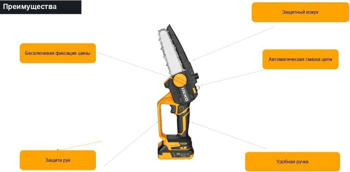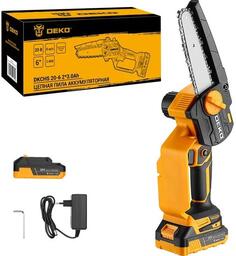 • Комплект поставки - Зарядное устройство- Шестигранный ключ- Крепежный комплект (пружина - 1 шт, шайба - 1 шт, винт - 1 шт) - 1 шт- Руководство по эксплуатацииПила поставляется в частично разобранном виде- Пила- Аккумулятор (один установлен) - 2 шт- Защитный кожух- Шина- Цепь