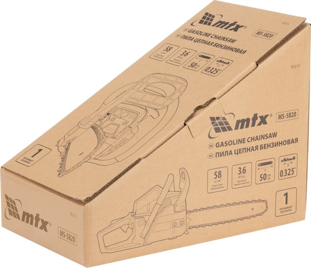 ✅ Цепная бензопила MTX MS-5820 95213 — это надежный инструмент с мощным двигателем объемом 58 см³ и мощностью 3,6 л.с. Она идеально подходит для распиловки древесины, валки деревьев, а также для опиливания сучков и заготовки дров. С шиной длиной 50 см и цепью с шагом 0,325″, эта бензопила станет незаменимым помощником в саду и на строительных площадках.✅ Быстрый старт обеспечивается благодаря насосу подкачки топлива (праймер), что делает запуск двигателя легким и удобным. Безопасность эксплуатации гарантируется функцией блокировки газа, которая предотвращает случайный запуск, а тормоз цепи снижает риск травм при отскоке пилы.✅ Комфортная работа с MTX MS-5820 обеспечивается зубчатым упором, который помогает удерживать инструмент и уменьшает отдачу. Высокий ресурс работы достигается благодаря автоматической подаче масла к шине и цепи, что значительно снижает износ пильной гарнитуры.✅ Подготовка к работе не займет много времени — натяжение цепи регулируется с помощью винта. Удобное приготовление топливной смеси также не станет проблемой, так как в комплект входит емкость для смешивания бензина и масла.⚠️ Для удобства хранения и транспортировки предусмотрен защитный чехол для шины, что делает использование бензопилы MTX MS-5820 еще более практичным. Этот инструмент станет отличным выбором для тех, кто ищет качественную и надежную бензопилу для различных работ.✅ Цепная бензопила MTX MS-5820 95213 — это надежный инструмент с мощным двигателем объемом 58 см³ и мощностью 3,6 л.с. Она идеально подходит для распиловки древесины, валки деревьев, а также для опиливания сучков и заготовки дров. С шиной длиной 50 см и цепью с шагом 0,325″, эта бензопила станет незаменимым помощником в саду и на строительных площадках.✅ Быстрый старт обеспечивается благодаря насосу подкачки топлива (праймер), что делает запуск двигателя легким и удобным. Безопасность эксплуатации гарантируется функцией блокировки газа, которая предотвращает случайный запуск, а тормоз цепи снижает риск травм при отскоке пилы.✅ Комфортная работа с MTX MS-5820 обеспечивается зубчатым упором, который помогает удерживать инструмент и уменьшает отдачу. Высокий ресурс работы достигается благодаря автоматической подаче масла к шине и цепи, что значительно снижает износ пильной гарнитуры.✅ Подготовка к работе не займет много времени — натяжение цепи регулируется с помощью винта. Удобное приготовление топливной смеси также не станет проблемой, так как в комплект входит емкость для смешивания бензина и масла.⚠️ Для удобства хранения и транспортировки предусмотрен защитный чехол для шины, что делает использование бензопилы MTX MS-5820 еще более практичным. Этот инструмент станет отличным выбором для тех, кто ищет качественную и надежную бензопилу для различных работ.