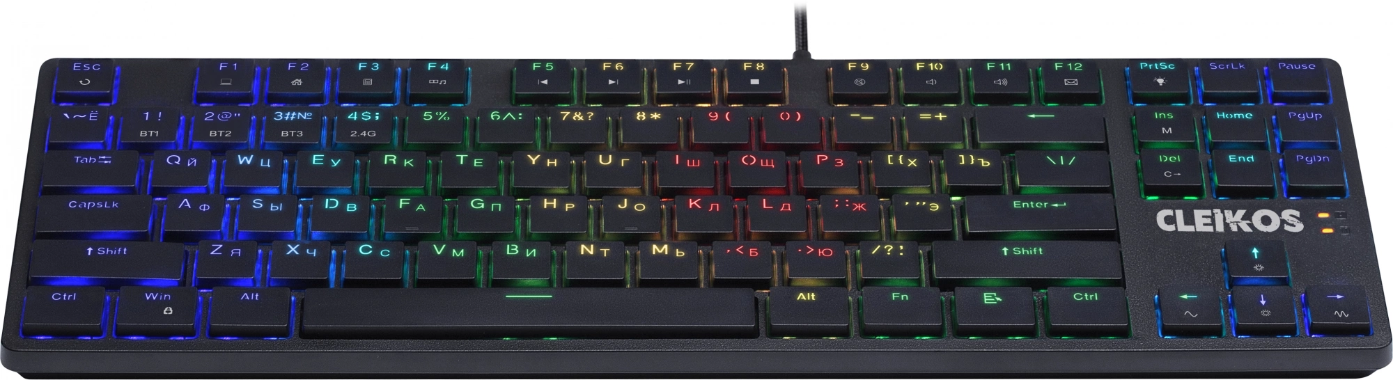 Особенности3 режима подключения: проводное подключение, беспроводной режим Bluetooth, беспроводное подключение по радио каналу 2.4 ГГц. 20 режимов подсветки. Функция Anti-ghost. Технология Hot Swap. Ферритовый фильтр помех