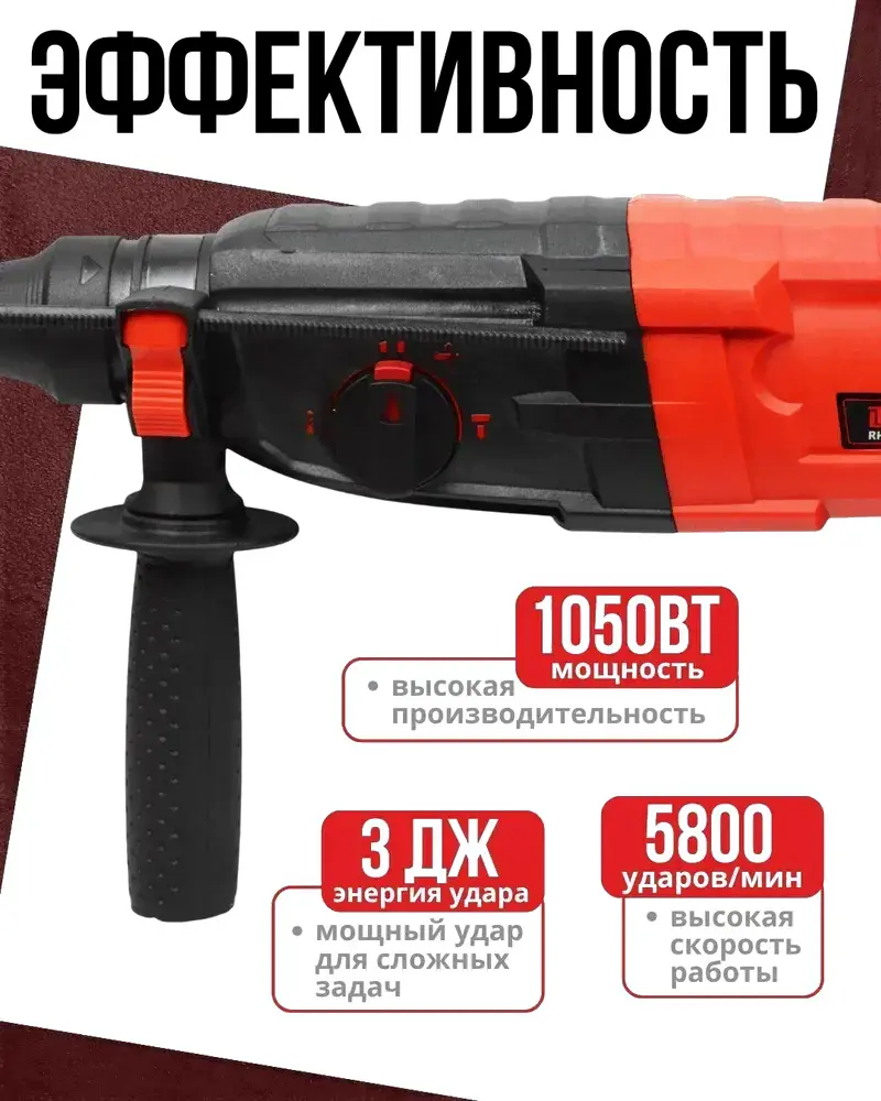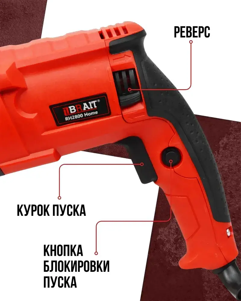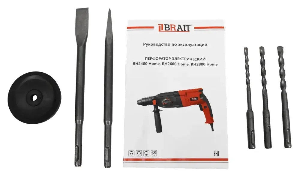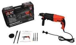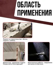 • Дополнительная комплектация кейс, бур (6,8,10 мм), зубило, долото, пыльник, ограничитель глубины сверления