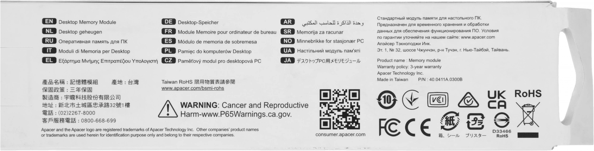 Память DDR5 32GB 4800MHz Apacer FL.32G2A.PTH RTL PC4-38400 CL40 DIMM 288-pin 1.2В Ret