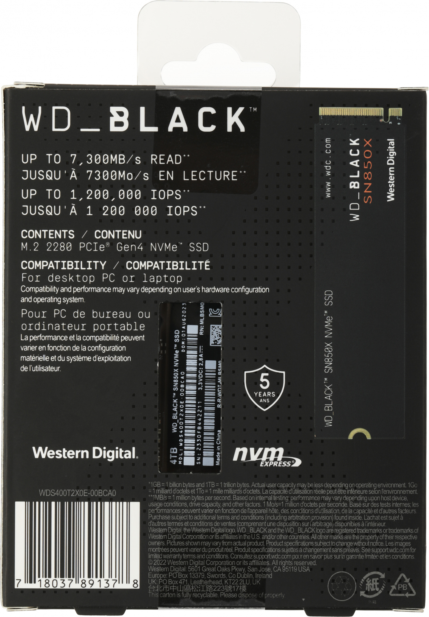 Накопитель SSD WD PCIe 4.0 x4 4000GB WDS400T2X0E Black SN850X M.2 2280